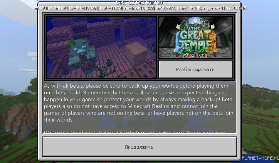 Забыв о версии 1.2.13, разработчики сразу выкатили Майнкрафт 1.2.14.3 на Андроид. В новой версии МСПЕ 1.2 появились новые биомы, мобы и добавлено ряд новых элементов. К тому же, выпуск 1.2.14.3 избавлен он зависания на стартовом экране, которое наблюдалось у многих игроков в начале игры.