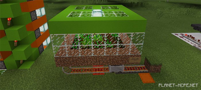 This is an automatic crop farm utilizing items from MCPE, such as rail tracks, minecarts, and several hopper systems.