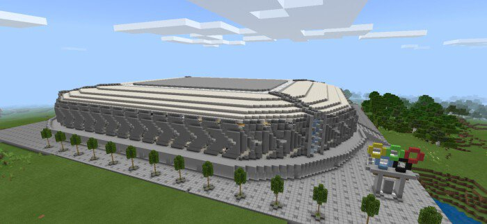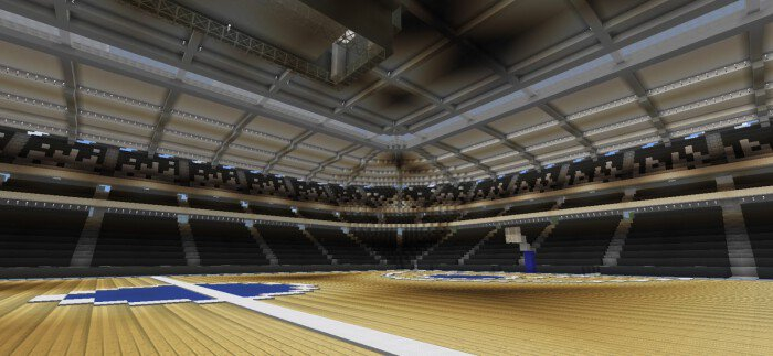 The map titled “Basketball Arena” features an extensive baseball stadium within Minecraft. While the exterior may not be particularly vibrant, the interior boasts a modern and varied design.