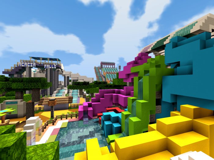 Wave pools, rafting, and water slides. What could be more enjoyable than that? Outside of MCBE, of course. The map creator has crafted beautiful landscapes set against the park and also altered the textures of the sky.