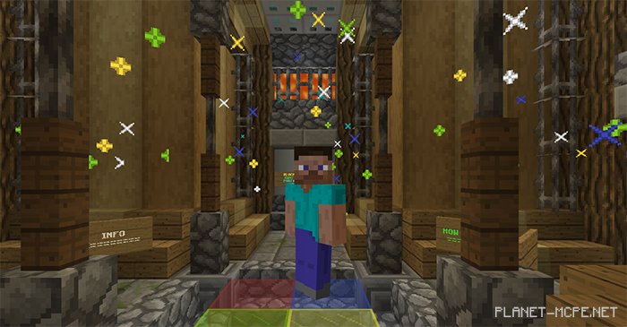 The map «Block Hunt Party» is a multiplayer mini-game where players in Minecraft PE compete against each other to collect all 5 elemental blocks as quickly as possible. These blocks are scattered around a medium-sized arena, primarily at the edges, and you must find them swiftly if you want to win in MCPE. A minimum of two players is required to play on this map.