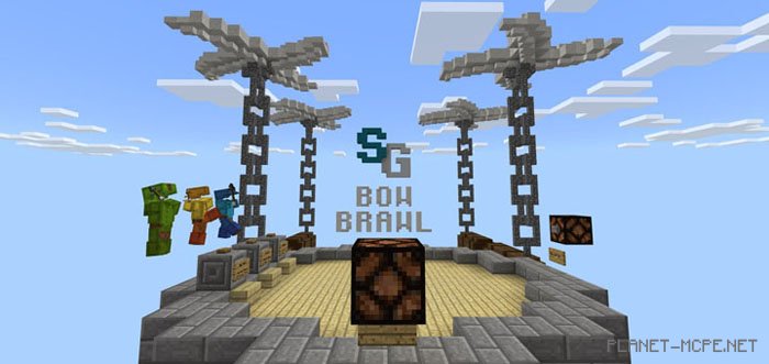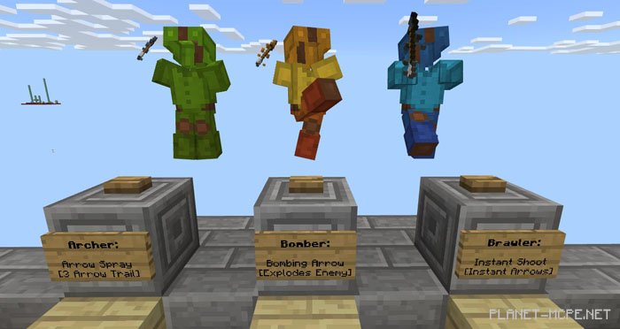 Map “Bow Brawl (Archery Battle)” is a multiplayer team game where your objective is to knock opposing players off their flying platforms in Minecraft Pocket Edition. You can leap between the platforms and various levels, but shooting while jumping is not allowed! Choose from one of three kits to eliminate your foes in MCPE. The kits can either explode enemies, shoot them with instant surprise arrows, or unleash massive waves of projectiles!
