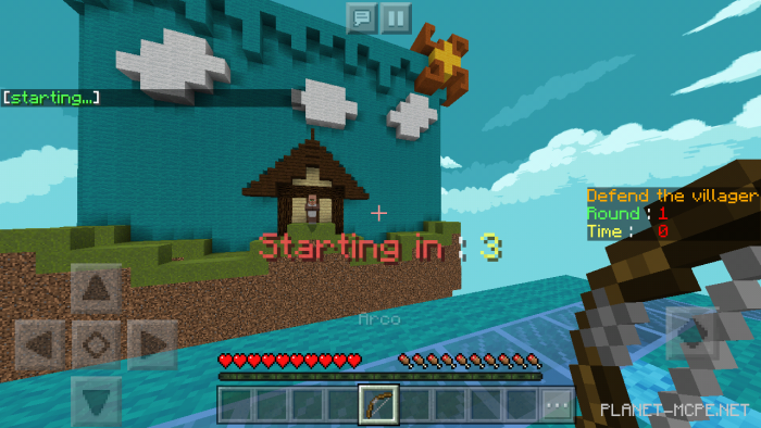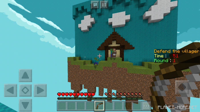 Map “Defend The Villager” is an entertaining mini-game suitable for any Minecraft player. Your mission is to protect the villager from incoming zombies that will spawn. You will only have a bow and arrows at your disposal, along with 10 levels, each lasting 1 minute.