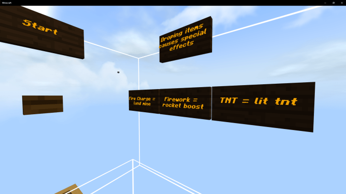 Different items produce various effects. The fire charge transforms into a land mine surrounded by particles. When placed, TNT activates and detonates after a brief delay. Fireworks launch you high into the air; simply place them on the ground or throw them to activate.