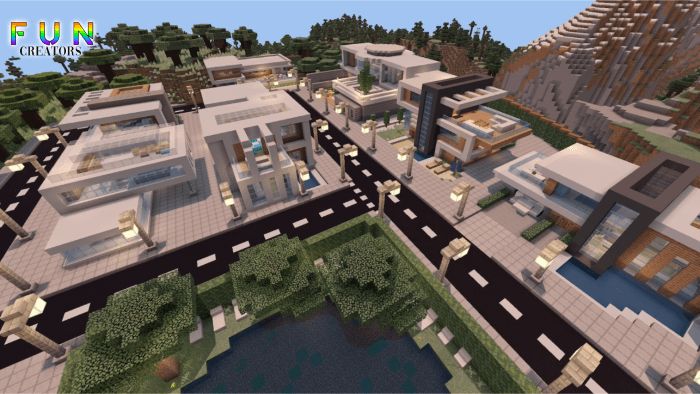 This map was created by just three individuals. The theme park includes numerous attractions and landmarks, such as water rides and roller coasters. The city boasts both small houses and towering skyscrapers, providing plenty of areas to explore!