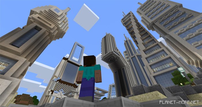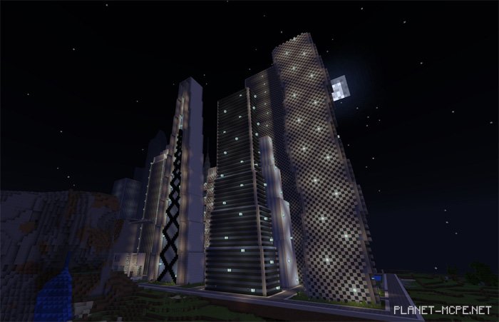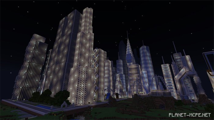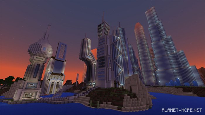 Do you enjoy wandering through fascinating cities and discovering their architectural features? I believe there are many players of Minecraft PE who do! That’s why today we invite you to download the mapFuturetroplis (City of the Future)” for Minecraft Pocket Edition. This map showcases a vast city located along the coast of a plains biome. It’s an impressive creation with stunning views and numerous intriguing districts filled with skyscrapers that reach high into the sky. You will surely find plenty to do in this MCPE map, as there are areas that can be enhanced. For instance, some rooms within the buildings are completely empty, allowing you to furnish them as you wish. Nevertheless, the city is simply breathtaking!