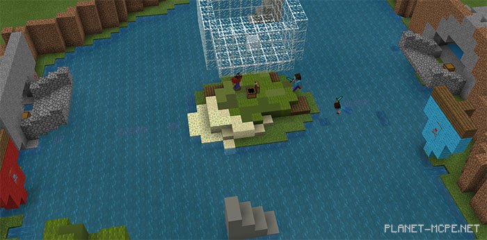 To start the game, you’ll need at least two players in Minecraft. Grab a shirt from the chest and put it on. Then swim towards the island, and if you make it there, you’ll need to collect the gold ingot from the chest. If you succeed, that round’s point is yours!