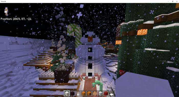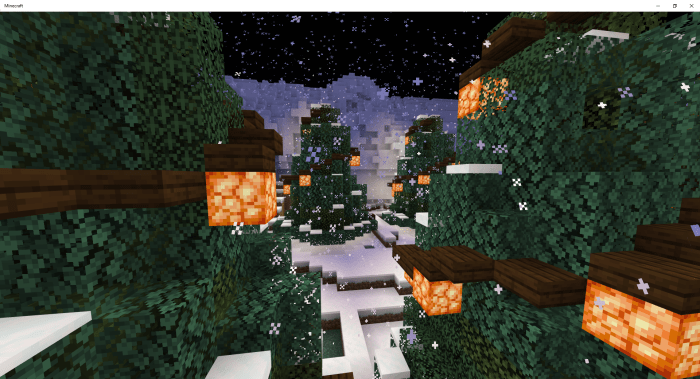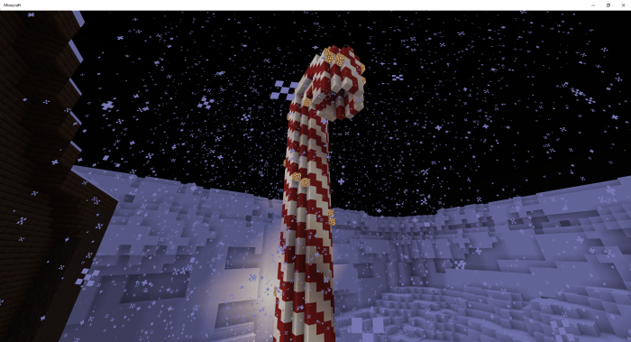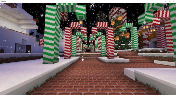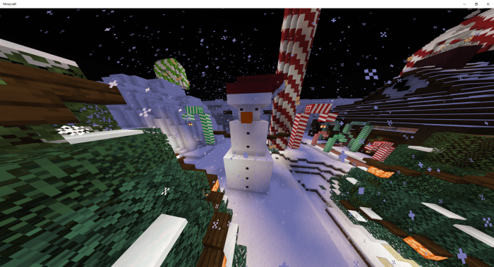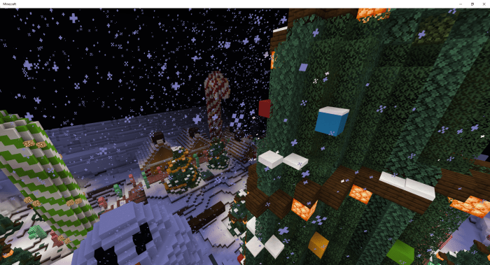 Massive candy canes. Gingerbread houses. A giant Christmas tree. Smaller Christmas trees. A few tiny lollipops. Small snowmen. Large snowmen. Alongside the map, a texture pack will be available in Minecraft. This pack transforms glazed terracotta into gifts. Spruce planks become gingerbread blocks, while some trapdoors turn into Christmas lights.