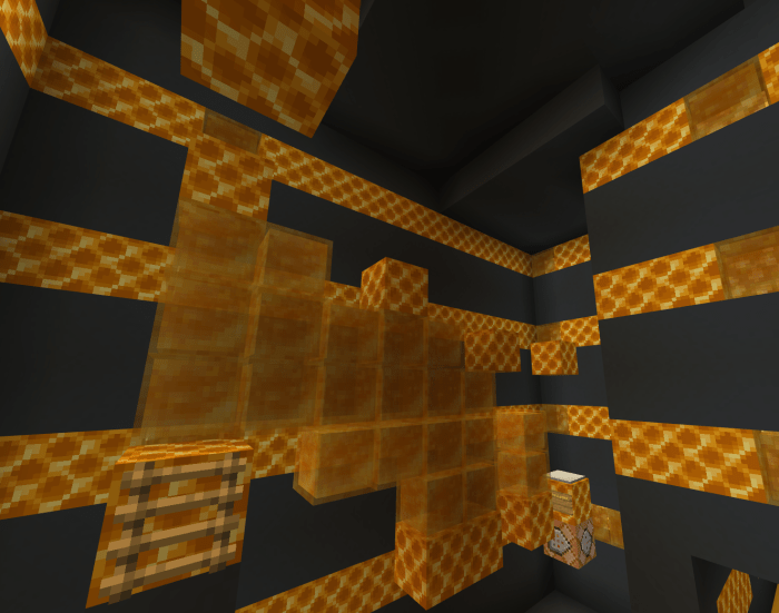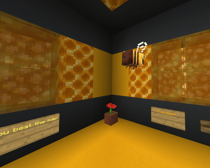 Upon entering the map, you will find yourself in a lobby: Level One: The basics of honey. At this stage, nothing is too challenging; it’s just standard parkour across honey blocks. Level Two: I can’t jump. Initially, moving on the honey blocks may prove difficult, but there’s a secret to make it easier. Level Three: You’ll hate the creator. Few enjoy mazes in Minecraft, let alone honey mazes. Level Four: Build it yourself. Some blocks are missing at this level. Complete the map first before attempting to progress. Level Five: Honey isn’t bouncy. To balance out the maze’s difficulty, the creator has included a dropper. Many players love droppers! Level Six: Almost there. Reverse dropper. This time, you’ll be flying upwards, aiming to avoid colliding with blocks. If you hit even one, you fall. Game Over. After finishing the game, you will be teleported to a room filled with bees and flowers. There, you can choose to replay or switch to spectator mode.