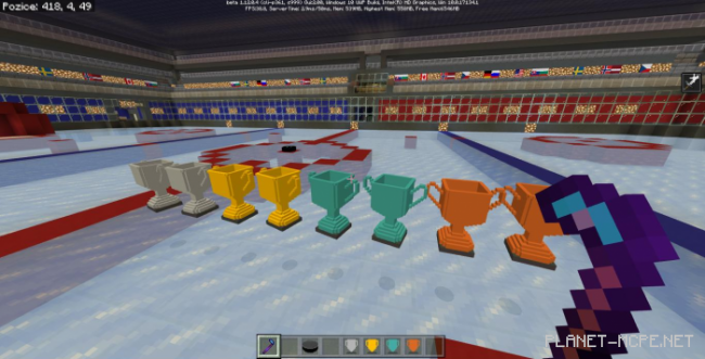The second update to the map, which is also the latest one, was inspired by the 2019 Ice Hockey World Championship (IIHF World Cup 2019). The author dedicated a month to prepare this update. A roof was added above the stadium, redesigned for better aesthetics, along with a fully automated scoreboard system. Additionally, the mechanism that returns the puck to the center of the arena has been revamped; it now operates automatically without the need for carts or tracks.The map has been adjusted to meet all standards of Minecraft Bedrock. Now, every newly added mob acts as a unique entity, necessitating changes in their behavior. The appearance of the puck has become more realistic, and its hitbox has been corrected. Trophies made of diamond, gold, silver, and bronze have been introduced, along with new sticks, jerseys, and food items. The map supports 29 languages.Here’s a video demonstrating how the map works: