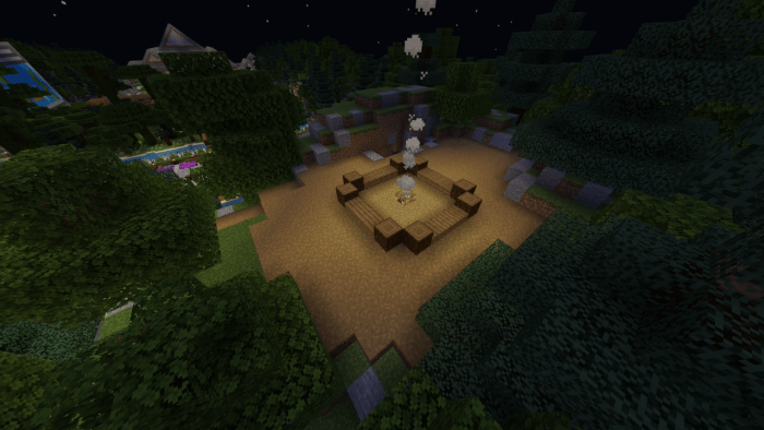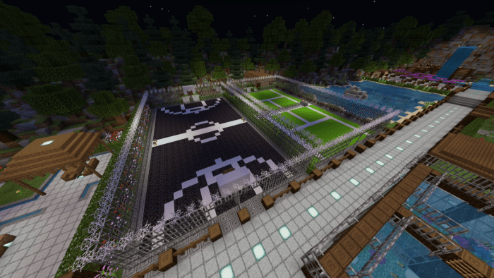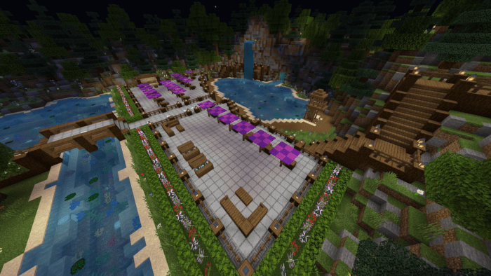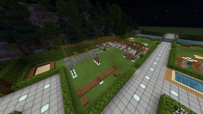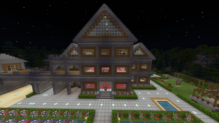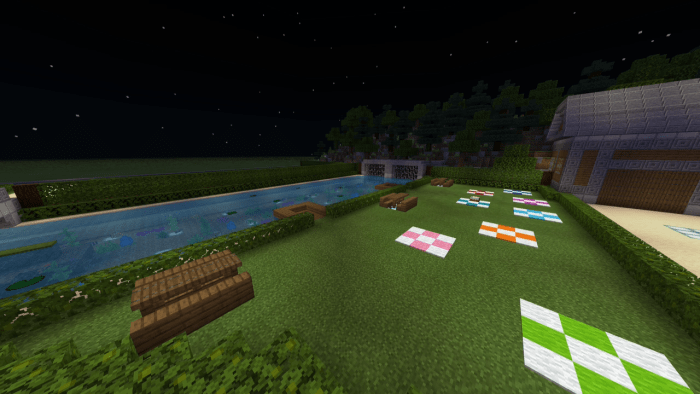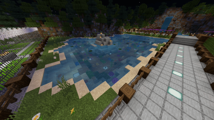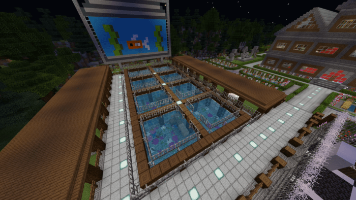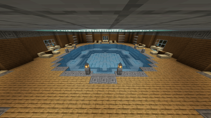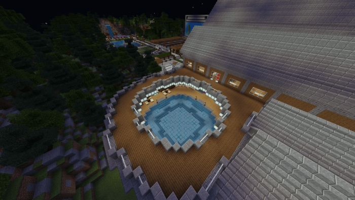 The backyard is equipped with a swimming pool featuring a jacuzzi, an outdoor event bar, a tennis court, a basketball court, and an aquarium filled with exotic creatures. Surrounding the mansion is a forest along with a small camping site. Additionally, you can hike up to a tall waterfall that offers stunning views of the Minecraft world!