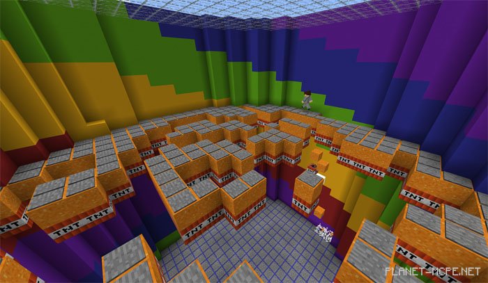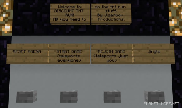 Discount TNT Run is an intense mini-game map that you can enjoy solo or with friends. You will be racing on a medium-sized arena in Minecraft PE, featuring a floor made of pressure plates, sand, and TNT. Activating the pressure plates will cause TNT to spawn, turning the sandy ground beneath you into an endless void. Your primary objective in MCPE is to survive for as long as possible!