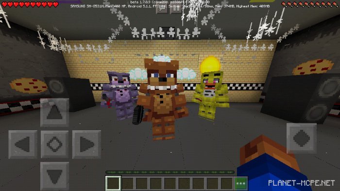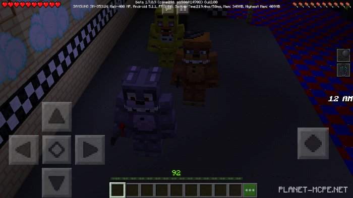 Survive for five nights from 12:00 AM to 6:00 AM alongside the animatronics Freddy, Bonnie, Chica, and Foxy on the map titled Five Nights at Freddy’s. Monitor the cameras in the pizzeria to track their movements within Minecraft. Turn on the lights and close the doors when you’re near your small office, but be cautious—your energy won’t last long enough to maintain safety throughout your time in Minecraft Bedrock.