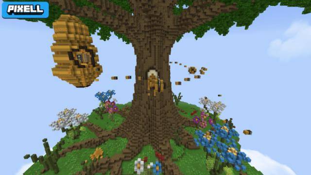 Of course, this hive is home to a large number of bees. They are not particularly pleased with uninvited visitors. Additionally, the creators of the map have included several Minecraft Bedrock skins that you can use with your friends while playing the mini-game.