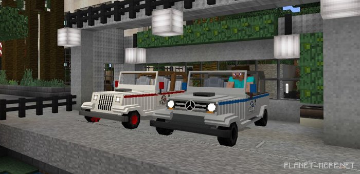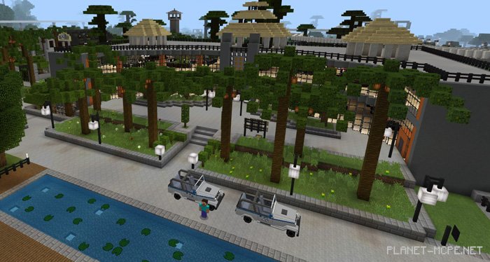 Upon spawning on this map for Minecraft Pocket Edition, you’ll find yourself at the edge of the area, inside a fantastic hotel. If you wish to stroll through the park and see all the attractions, you’ll need to step outside and walk a bit, but it won’t take long because a real jeep awaits you nearby, significantly speeding up your journey!