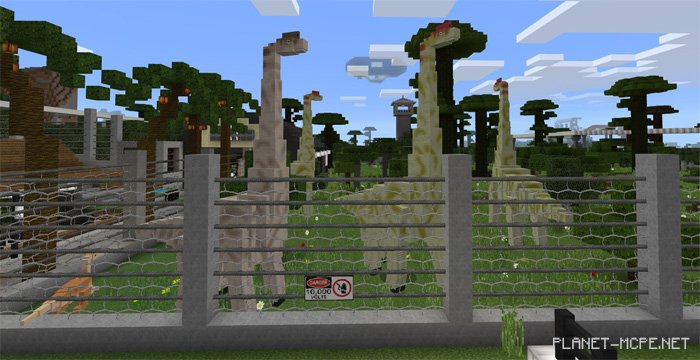 Throughout the park, you’ll discover many other fascinating dinosaurs that will amaze you. Most of them are separated by fences to prevent any unfortunate incidents in the world of MCPE.