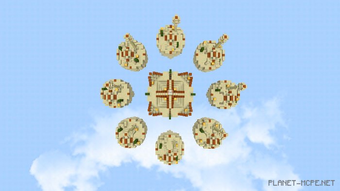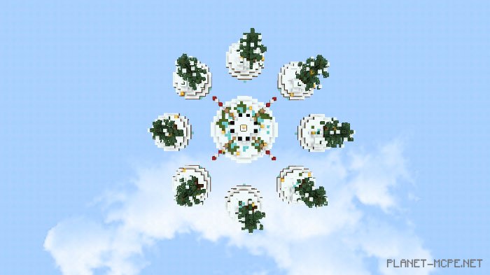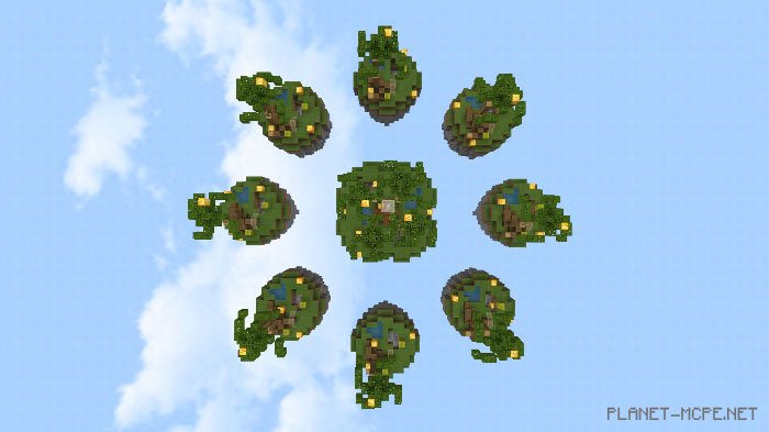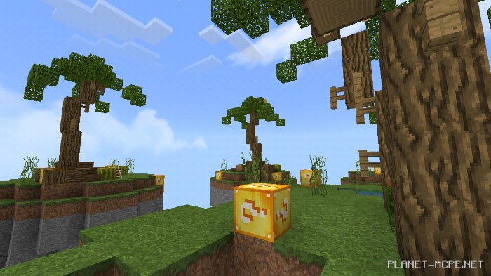 Lucky Islands is a PvP map where you can engage with 2 to 8 players. You will spawn on one of the islands and must search for items to survive as long as possible while battling against other players in Minecraft Bedrock. Your goal is to eliminate all other competitors. A fascinating feature of this map includes lucky blocks that appear in various locations across the islands. The most exciting part is that breaking these blocks in Minecraft can yield both beneficial and detrimental items.
