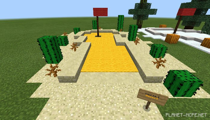 Introducing a new mini-game for Minecraft PE, inspired by mini-golf. On the map “Matt’s Minigolf: Biomes Edition,” you will find 10 unique courses, each themed around a specific biome from MCPE. Play solo or invite your friends to join in on the fun. Each player receives a ball with the objective of sinking it into the hole (the bunker under the flag) using the fewest strokes possible. Strike the ball and watch it glide over ice beneath the carpet. Some courses present additional challenges like soul sand, slime blocks, and water.