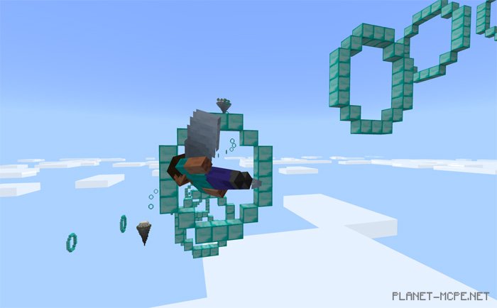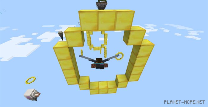 The map «Nine Levels (Nine Levels)» features 9 unique levels divided into five sections. This map is designed for elytra flying, meaning you will soar through the air to complete various challenges in Minecraft Pocket Edition. Your main objective is to fly through rings and land on islands to advance to the next level. This map can be played in both single-player and multiplayer modes (up to 2 players).