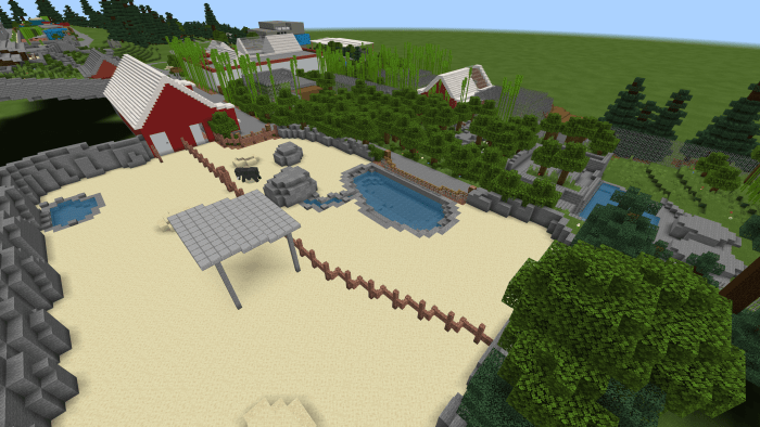 It boasts the largest area in the zoo Minecraft Bedrock. This space is home to animals and plants from Southeast Asia, including the Anoa lowland regions. You can find siamang gibbons, white-cheeked gibbons, Asian elephants, and Sumatran tigers there.