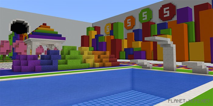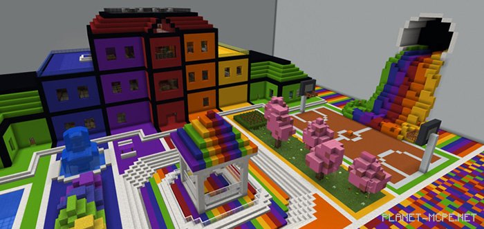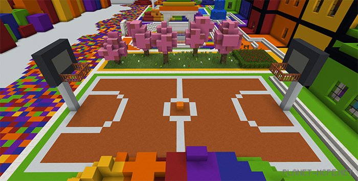 On the map “Rainbow Highschool,” you will discover a vast, vibrant, and colorful school within the world of Minecraft. This location features numerous rooms, a basketball court, and even a swimming pool. The bright color scheme is designed to make the school more engaging and less dull or monotonous. Additionally, the map includes rainbow wings and an ultra-rainbow add-on that enhances the game with even more rainbow effects in Minecraft Bedrock.