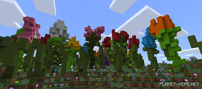 The Flower Forest is filled with towering flowers, allowing you to appreciate the scale of the Smurfs in Minecraft Bedrock.