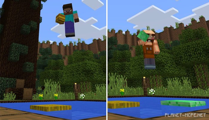 Players need to jump from a height (in this case, it’s happening on the Tree map). Below, everyone will notice a small pool of water, which is where they need to jump to survive. Your goal on this map for MCPE is to survive the fall by landing in the water while also placing one block. It’s crucial that the block is placed in the water during your descent.