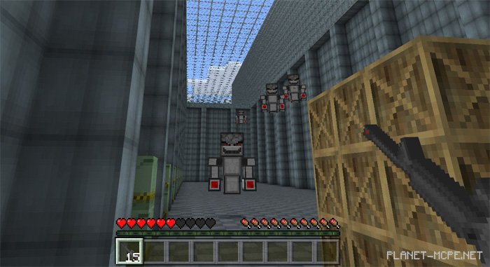 On this map, you can expect plenty of action involving robots and an epic showdown with a boss at the end. This boss poses a greater threat than all other robots in Minecraft PE, but this time you’ll be equipped with weapons to fight back.