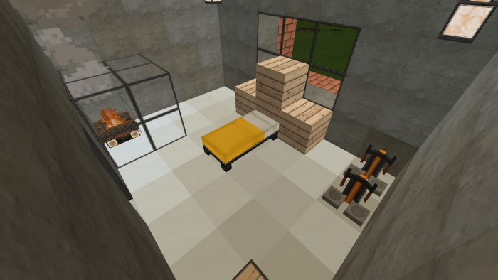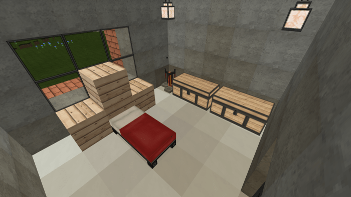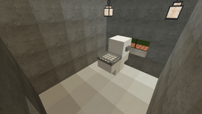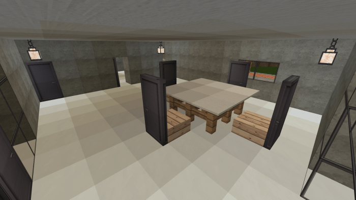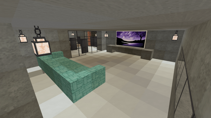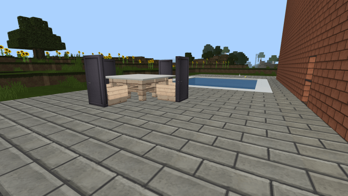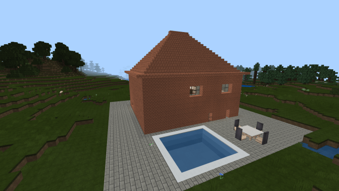 On the map titled “Minecraft Family Home #1” in Minecraft Bedrock, there is a spacious house designed for families and their guests. The second floor features four bedrooms, two bathrooms (one upstairs and one downstairs), and a guest room with a large dining table. Meanwhile, the first floor boasts a roomy living area equipped with a television and a sofa. From the living room, you can access a door that leads outside, where you can enjoy swimming in the pool or dining al fresco. Adjacent to the restroom on the first floor is a kitchen stocked with everything your character needs in Minecraft.