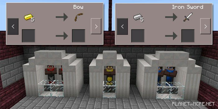 You can trade iron ingots for valuable weapons from merchants. Additionally, these merchants offer items that can be purchased with gold. You can only obtain gold ingots from the central island of this MCPE map.