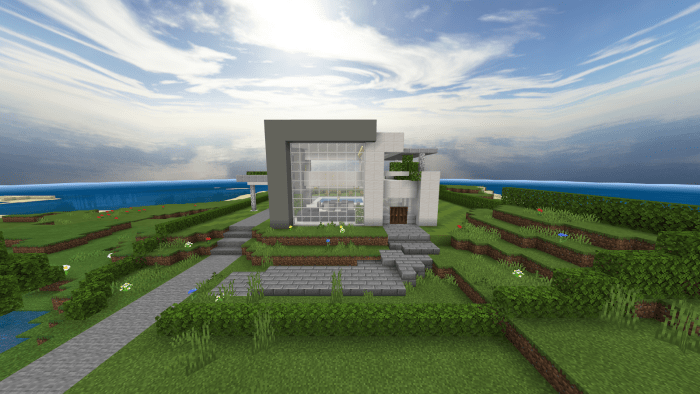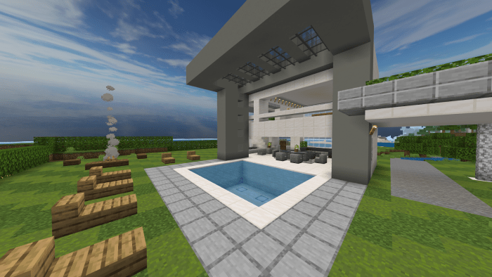 A compact contemporary residence Minecraft Bedrock map titled «Mini Modern House» features a minimalist aesthetic, complete with a swimming pool, kitchen, dining area, and an extra room. Who would have imagined that such a tiny house could accommodate everything a Minecraft character needs!