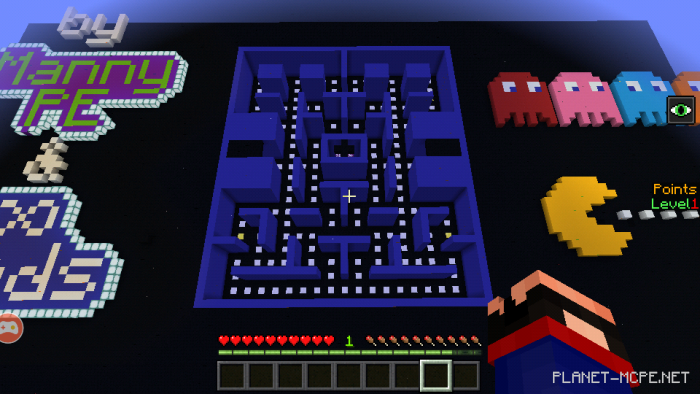 If you’re playing with friends in Minecraft Bedrock, your goal remains unchanged compared to single-player mode; however, it becomes significantly easier to collect points in the maze. Additionally, the “Pac-Man power” effects will apply to all players. Each player has 3 lives, and if they run out, everyone will become spectators. If all players lose their lives, then “game over”!