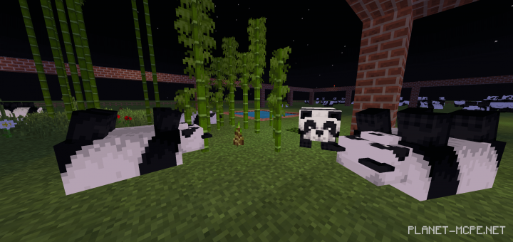 Oh! Here are some pandas! In the spacious panda field within Minecraft, there are small water reservoirs, tiny bamboo farms, and of course, plenty of pandas!