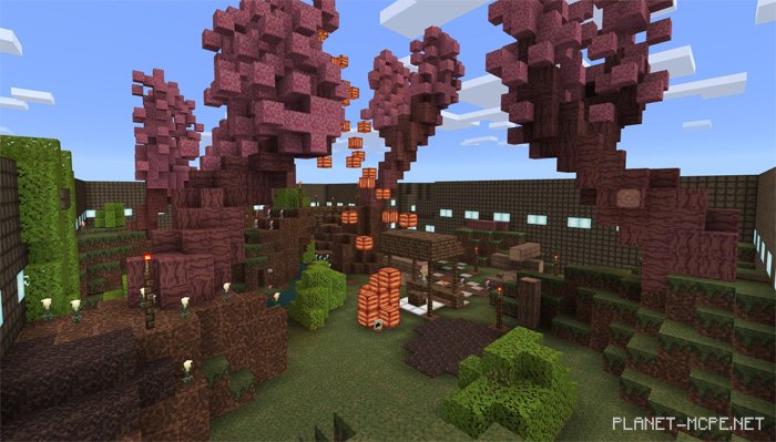 Paradiscal’s Paintball 3: Sakura Swamp is the third map in the paintball series by Paradiscal. This new arena stands out significantly from its predecessors. The map is slightly larger than earlier versions and features numerous hiding spots within Minecraft PE. This is particularly advantageous if you have more than two players, as it provides ample space to maneuver. This map for MCPE includes a mod that introduces paintball along with other customizable elements.