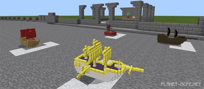 Racing Kit Map for Minecraft Pocket Edition features a sizable racing track set in a flat world. This map comes with an add-on that allows players to spawn racing cars in MCPE. These are primarily small go-karts designed to resemble ships. You will be amazed by the intricate details and stunning appearance of the models. It is recommended to play this map for Minecraft Pocket Edition with larger groups, so gather your friends!