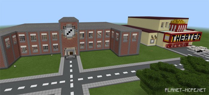 The creation on the mapSchool and Neighborhood” features a small community, a school, a theater, and several other buildings. This is an excellent map for Minecraft Pocket Edition, which can be utilized for role-playing or expanded into a vast city or even a metropolis; the possibilities are endless. I hope many of you will find great uses for this map, regardless of your choice. Everything is constructed in a flat world of Minecraft PE, so there are some limitations when it comes to exploration.
