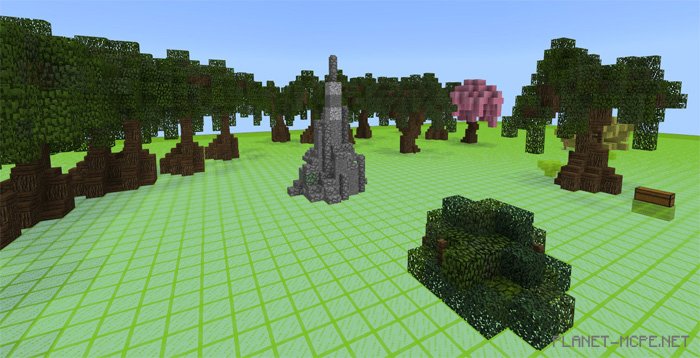 The map «SG Custom Terrain Maker (Custom Landscape Creator)» features a landscape creator that allows you to quickly and efficiently design your own stunning terrains in Minecraft Pocket Edition. At the spawn point, you’ll discover a chest filled with various items. Some of these can be used for instant tree and structure creation, as well as altering the terrain.