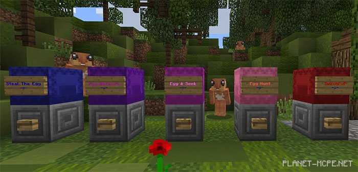 The map «SG EasterFest (Easter Festival)» is the third installment of the beloved mini-games festival by SkyGames. This map features five unique Easter-themed mini-games, including egg hunting and egg defense. You can choose to play with other players in Minecraft PE or go solo; the choice is yours. However, some games require at least two players to participate. Happy Easter!