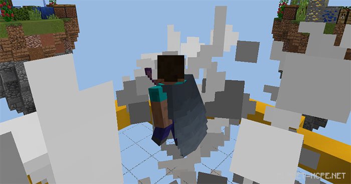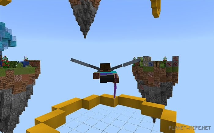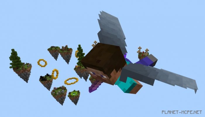 Engage in aerial battles in Minecraft PE with elytra wings. Fly through rings and strive to be the last player standing on the map SG Elytrax (Elytra).” At the start of the match, you will receive 5 seconds of invincibility, after which you must take off and fight against other players on the islands in MCPE. You can easily reach higher islands by flying through a yellow ring that will propel you upwards into the sky. This means the game could last for quite some time or at least until only one player remains alive.