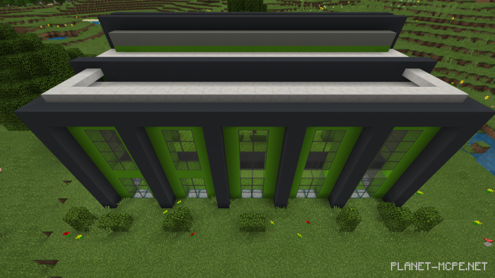 On the map “SG Lime – Castle House Mansion,” you will find a vibrant green house situated in a simple biome of Minecraft. The exterior features bushes and flowers that surround this minimalist modern home. It boasts windows on all sides, along with an opening at the top to let sunlight in. Inside, there is ample space for any constructions you wish to add in Minecraft Bedrock, as well as a partial layout to assist you in planning the arrangement of rooms within the house.