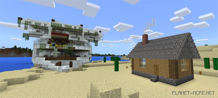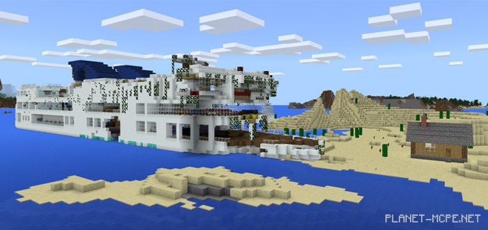 The shipwreck island featured on the map titled “Shipwreck Island” is ideal for survival gameplay and role-playing adventures. A cruise liner has become stranded on a deserted island within the world of Minecraft Pocket Edition. On this island, you’ll find a small cabin that serves as a perfect shelter for your first night. However, to survive, you must take action by either scavenging the ship or exploring your surroundings for resources in the realm of Minecraft PE.