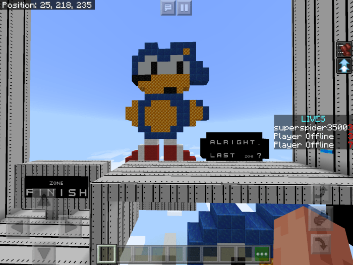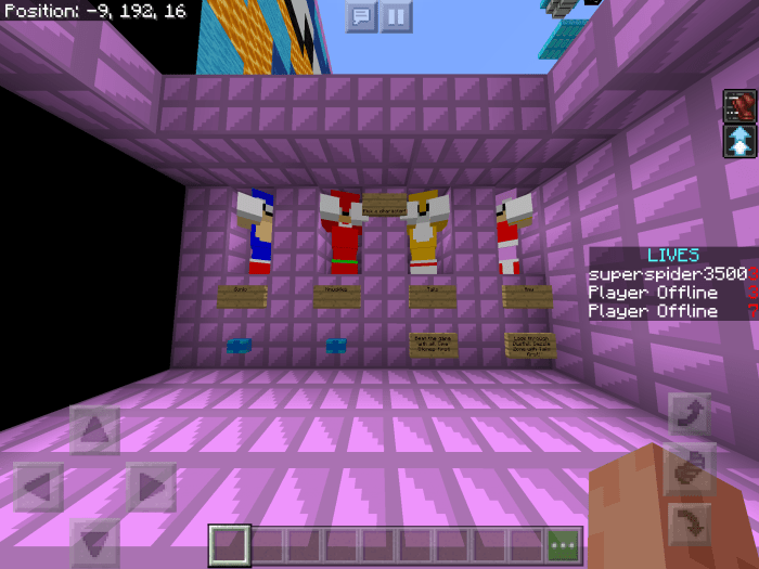 Map “Sonic the Hedgehog 2: Sonic’s Time Adventure” for Minecraft Bedrock, inspired by the classic game, features a total of 21 zones, 50 levels, and 13 special sections, along with 4 playable characters. It also includes key elements from the Sonic franchise such as springs, boss battles, screens, animations, music, and more.