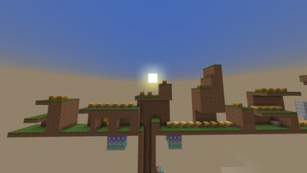 All eight zones, except for two, consist of three acts each. The Heavenly Base and the Doomsday zones feature only a single act. These zones include: Palm Panic, Marble Mine, Energetic Hive, Mystical Cave, Volcanic Village, Heavenly Base, Mechanical Green Hills, and Doomsday.Marble Mine Zone, Act 2.Energetic Hive, Act 1.Volcanic Village, Act 1.Heavenly Base. Command blocks from Minecraft were utilized in creating the scoreboard and rings; overall, the map was developed over a period of just more than a month.