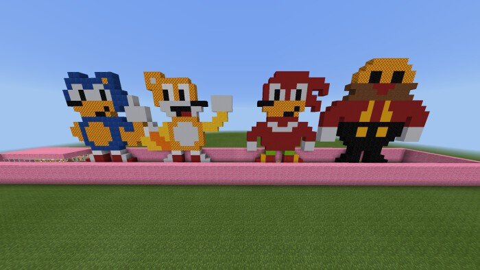 Welcome to the map titled “Sonic the Hedgehog: The Chaos Quest” in Minecraft! This game features a total of 22 levels inspired by the beloved characters from the well-known video game and includes a unique resource pack along with custom animations. The creators have also implemented functional rings, monitors, a life system that decreases when you fall into pits, two types of endings, and three playable characters: Sonic (the fastest), Tails (who jumps the highest), and Knuckles (the strongest). Before starting the game, you need to select one of the three characters. After that, you’ll enter a room where a button is located; press it to begin your adventure. The rules remain the same as in the original Sonic game: run and jump over walls and pits. Palm Panic. This level offers numerous features: a gallery where you can view your characters and various objects, level selection, including two hidden ones—Palace Zone and Ice Cap Zone. To collect all seven Chaos Emeralds, you must complete all seven levels, each more challenging than the last. At the very end, you will transform into Super Sonic!