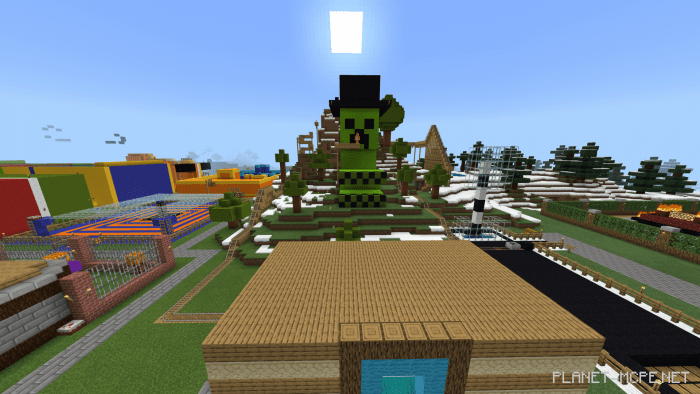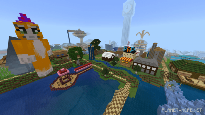 This map showcases a realm of stunning chaotic constructions within the world of Minecraft. The tallest and most magnificent structure is a tower reminiscent of London’s Big Ben.