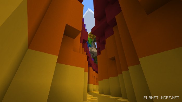 Massive ravines will emerge (some containing ores), all enchanting and beautiful in Minecraft Bedrock. If you dig underground, you might discover a colorful End room. This feature isn’t part of natural generation in Minecraft, so /locate won’t work. In the future, if this concept resonates with players, I’ll strive to create colorful dimensions!