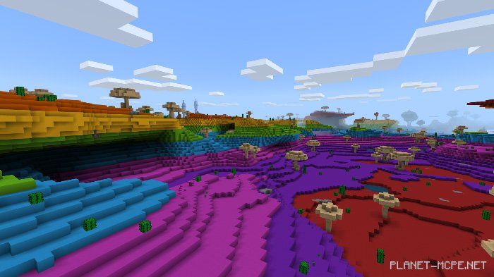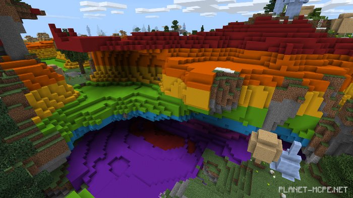 The map “The Palette Place” is a vibrant wonderland in Minecraft, as the name suggests! It introduces a new biome to my landscape series called rainbow1, allowing concrete to appear in various locations based on world growth.