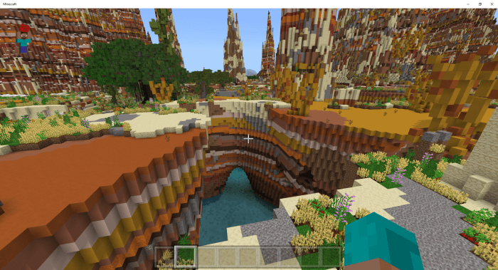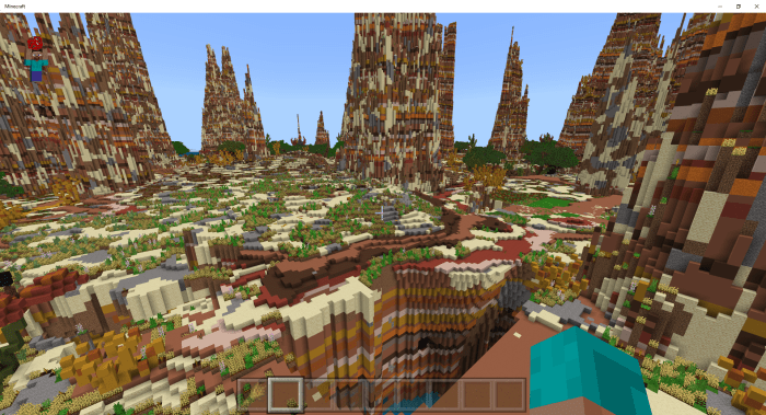Countless years ago, life emerged in the barren lands of Minecraft. The map titled “ThrivingBadLands (Flourishing Barren Lands)” captures the moment when majestic plateaus began to rise. From the dry, nearly lifeless ground, columns of bedrock suddenly burst forth, soaring high into the sky and reaching astonishing heights. Alongside this transformation, a new source of life—water—was introduced to Minecraft.