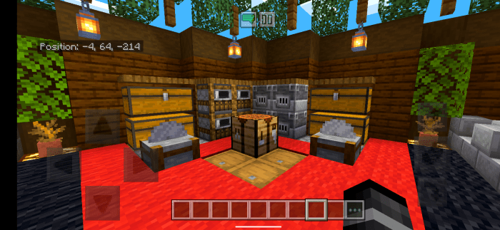 Mini-farm. A space that contains chests for item storage, a furnace, and more. An enchanting table, brewing stand, and tools for repairs. A lounge area. Nether portal. Beacon.