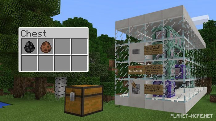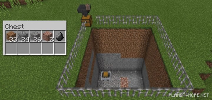 Upon spawning on this map for Minecraft Pocket Edition, you’ll see a large mechanism designed for ore collection. First, press the button to spawn a chest in front of you. Inside the chest are special items that allow you to activate ore extraction. Use the quarry egg (which replaces the cow spawn egg) to spawn the quarry.
